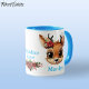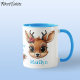 Celebre a temporada de férias com esta caneca festiva com jante azul e manípulo com cartoon cartoon carinhoso de veado-bebê bonitinho com galhadas e poinsettias escondidas nos ouvidos. O nome e Reindeer Love estão escritos em azul-céu. A xícara perfeita para você, ou como um presente pensativo, este pombo capricho faz uma manutenção cuidadosa por anos. Aproveite este design floral! Personalizar alterando o texto, a fonte, a cor da fonte ou removendo o texto. Você pode até transferir este design para outros produtos. Verifique a ForestBabies Xmas Deer Collection para produtos correspondentes. 🎄 🦌