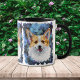 Quem perdeu o coração para um adorável Cachorro Corgi amará essa caneca atraente! Ele apresenta uma renderização de um artista de Pembroke Welsh Corgi olhando de um fundo pintado por abstrato. As cores predominantes no fundo são preto, azul, lavanda, com um toque de aqua. As cores quentes e legal no retrato do cão destacam-se lindamente do fundo. A imagem é repetida ao redor da caneca, e a imagem central tem texto personalizado em um script preto que diz "Corgi". Você pode personalizar o texto, personalizá-lo ou até removê-lo se preferir.