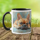 Dois lados desta caneca para o fã do Bulldog francês mostra um retrato de um francês marrom deitado com a cabeça entre as patas. O texto no centro diz "Bulldog Francês" mas você pode personalizá-lo facilmente ou mudá-lo para qualquer outra coisa que quiser.
