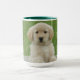 O ouro puro recupera um filhote tomando banho ao ar livre numa lavanderia de cor creme, sentada na grama com as patas na borda. Ela é um adorável cachorro-bebê de cor amarela e loira, com olhos castanhos e nariz preto.