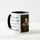 Caneca de café com citação da "Décima Segunda Noite" de William Shakespeare: "Não há escuridão, mas ignorância." Branco com interior e alça pretos e o retrato Cobbe, dito ser uma pintura de um jovem Shakespeare.