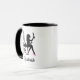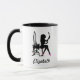 Personalize adicionando seu nome a esta caneca chique e à moda com uma silhueta de uma mulher da forma, vestindo calçados curados elevação do rosa quente com os arcos bonitos, sentando-se em uma vaidade da composição e admirando sua reflexão feminino do fashionista em um espelho.