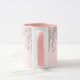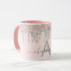 Uma caneca de moda e moda. Um fundo rosado feminino, cor-de-rosa, decorado com ouro rosa e brilho fino prateado. Personalize e adicione um nome e uma letra monográfica. Letras coloridas de cinza. O nome é escrito com um moderno estilo escrito à mão com traços. Para manter as hastes, exclua apenas o nome da amostra, deixe os espaços ou emoji na frente e depois do nome.