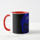 Enjoy this personalize coffee mug with your next latte. The product features a rotating blue accent geometric themed design.