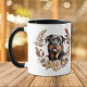 Uma bonito coroa de outono em tons de cinamão marrom, bronzeado e creme rodeia a imagem aquosa de um lindo Cão Rottweiler. A imagem é impressa duas vezes na caneca, com seu texto personalizado entre eles.