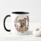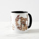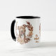 Uma bonito coroa de outono em tons de cinamão marrom, bronzeado e creme rodeia a imagem aquosa de um Cão Pitbull marrom e branco. A imagem é impressa duas vezes na caneca, com seu texto personalizado entre eles.
