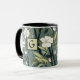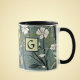 This lovely sage green floral mug features a beautiful Asian print of tropical flowers and golden green leaves in Chinoiserie style. Your initial appears in dark green against a chartreuse square, and is bordered in dark green on the front and back. Make sure to type your initial in the Personalize section. The mug is shown here with a black inside and handle but other options are available.