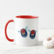 Sapatos azuis pequenos com combinação de cores vermelhas. Para os pais e para as pessoas que acreditam nos pequenos anjos.