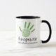 Esta caneca da quiroterapia caracteriza um impressão e um texto espirais verdes da mão que diga a "quiroterapia - saúde sem uma prescrição."