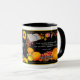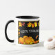 Uma bela caneca brilhante com vegetais sazonais, abóboras e maçãs, folhagem de outono, girassol, borboleta e Bíblia aberta, com palavras do Salm 106:1 e as palavras "GIVE OBRIGADOS" nas costas. Um lindo presente sazonal!
