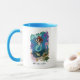 Uma sereia de cabelos vermelhos está entre um cavalo marinho, peixes-estrela, tartarugas, peixes-geleia e tesouro em um pano de fundo azul
