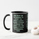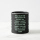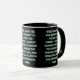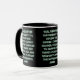 Esta caneca tem uma design que apresenta a oração de serenidade com uma impressão Rig Solid Medium com letras brancas contornos verdes sobre um fundo preto neste tema baseado na fé. A jante e o manípulo são vidrados em cores compatíveis, disponíveis em micro-ondas e máquinas de lavar louça de tamanho 11 onças ou 15 onças, construindo cerâmica segura.