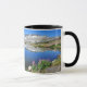 Flores cor-de-rosa no penhasco rochoso pelo lago azul