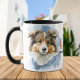 "A Sheltie kisses conserta tudo" declara esta caneca fofa para o dono do Shetland Sheepdog. A imagem em cada lado é uma imagem aquosa de uma Sheltie adorável. A imagem do cão é colocada em uma abertura de cor d'água azul abstrato.