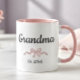 Simple Script Pink Girl Bow Grandma Est. (established) Year Mug. Script font design with a pretty pink bow. Switch out the date and switch "grandma" for how you call your grandmother. Add more years for more grandchildren. Contact designer for any customization questions.