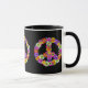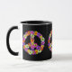 Um sinal de paz floral em tons de rosa, amarelo, laranja, roxo, verde, branco e preto.