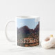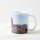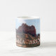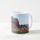 Branco e caçador verde 11 oz. caneca combinada com imagem de uma pintura aquosa de uma formação predominante e reconhecível de rocha vermelha próxima à cidade de Sedona, na base da Crimson Cliff.