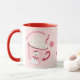 Uma caneca cheia de temas de Natal que faz um presente de Natal perfeito ou um gatilho. O design pode ser personalizado com o nome do seu filho e apresenta um design de chocolate quente de boneco de neve completo com chantilly, doces, doces de menta-pimenta e flocos de neve em rosa e vermelho.