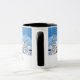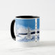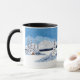 Uma caneca com uma bela cena de inverno, incluindo montanhas cobertas de neve, verdes e cabana rústica. As imagens e o texto podem ser personalizados, substituídos ou excluídos. Arte original por W.B.