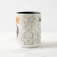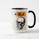 Caneca de café de Halloween com uma ilustração do crânio vintage com um fundo de texto angustiado e um sotaque cor de laranja "Boo!". Uma escolha assustadora mas na moda para a decoração gótica de Halloween, amantes de café ou presentes sazonais. Perfeito por adicionar encanto estranho à sua cerveja matinal ou às reuniões de Halloween.