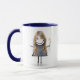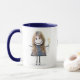 Bonita figura de palito com buquê margarida, tênis, cabelo, colar de pérolas e vestido de jean azul com uma citação inspiradora.