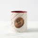 Possui um suéter creme de cardigã tricotado com botão de madeira. Uma caneca de suéter confortável para o seu café.