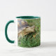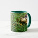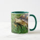 Fotografia da tartaruga Sulcata de estimação, Edwina Sulcata, pasto, boca aberta, em gramado. Imagem impressa em ambos os lados da caneca. Mug color, size e style são personalizáveis.