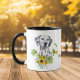 "AMA MEU DALMATIANO" declara esta caneca para o orgulhoso dono de Dal. Cada lado da caneca tem um belo retrato de aquarela de um cão Dalmaciano enquadrado por flores de girassol e folhas verdes. Misturados são prigos de eucalipto verde azul. Entre as duas imagens está o texto, que pode ser facilmente personalizado, ou mesmo removido, por você.