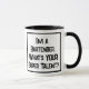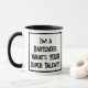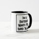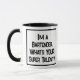 Um slogan engraçado numa caneca de café com dois tons que diz "Sou um Barman. Qual é o seu super talento?" Dois Tone Coffee Mug para um Barman, ou alguém que trabalha atrás de um bar. Texto preto e branco em negrito.