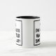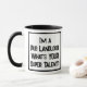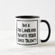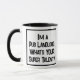 Um slogan engraçado numa caneca de café com dois tons que diz "Sou um Pub Landlord. Qual é o seu super talento?" Duas caneca de café de tom para um senhorio ou alguém que dirige um bar. Texto preto e branco em negrito.