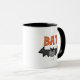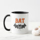 Um morcego preto do Halloween e um texto laranja que diz "BAT" em t-shirts de morcegos, fatos, canecas, cartões, autocolantes, sacos de tote, botões, ímãs e outras t-shirts e presentes MTD do Halloween.