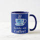 A caneca de café estilizada é cheia de um padrão floral azul e tocada com vapor de ascensão. Abaixo, a frase "menos conversa, mais café!" acrescenta um toque humorístico e relacionável perfeito para amantes do café.