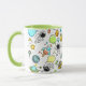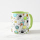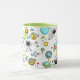 Caneca divertida de temática espacial apresentando astronautas, foguetes, naves espaciais, planetas e estrelas.