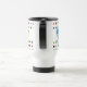 Uma caneca de viagem de aço inoxidável de 15oz com o cão Azyl, Nadel o gato e Ejiki o pintinho sobre um fundo de Peles de Açúcar.