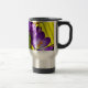 Várias crocas roxas, os arborizadores da primavera, sobre fundo geométrico preto e amarelo. As faixas da diagonal laranja e as folhas verdes dão lugar a uma design VIBRANTE, de acordo com as teorias da composição e do uso da roda colorida!
