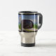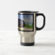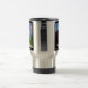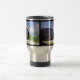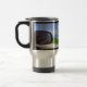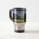 OBJETOS NO ESPELHO ESTÃO MAIS PERTO DO QUE PARECEM - Este é o texto nesta Caneca de Viagem de uma fotografia original de ZoeSPEAK, tirada enquanto dirigia pela estrada que sai de Key West, Flórida. A foto é uma vista pela janela da caminhonete do espelho retrovisor e da paisagem dos Keys, o grande céu azul, nuvens fofas, águas do Golfo e vegetação. Atrás da parte superior esquerda do espelho há uma placa de trânsito amarela e preta. Isso é refletido na janela da caminhonete como uma barra diagonal amarela no canto superior esquerdo da imagem.