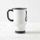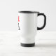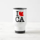 Gift your friend this travel mug with the Canadian Maple Leaf in red. The text is a version of American Typewriter. The text is bold and black. You can read it as "I Love Canada". CA is the two letter ISO country-code for Canada.