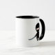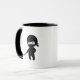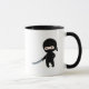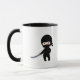 Ninja de desenho animado, bonito mas zangado, vestido de preto, está segurando uma tradicional espada japonesa de katana.