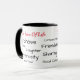 Esta caneca é mostrada com um interior preto e manípulo preto junto com palavras encorajadoras de "O tempero da vida" mostradas em vermelho e palavras de "bondade, família, riso, generosidade, boa comida, amizade, boas conversas" e assim por diante em texto preto de diferentes tamanhos. Personalize esta caneca ao seu gosto ou comprar, conforme projetado. Também disponível em toalhas de cozinha e artes de parede.