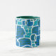 Uma caneca de café branca na moda com lábio e alça verdes e uma tartaruga abstrato, verde-marinho, padrão azul e branco profundos, de um impressão de serigrafia de Judy Adamson.