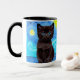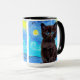 Café Mug apresentando um gato preto na pintura Starry Night de Van Gogh! Este gatinho de olhos azuis brilha adoravelmente de um fundo de espirais azuis e uma lua amarela brilhante. Um presente fantástico para amantes de gatos e colecionadores de arte holandeses!