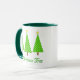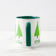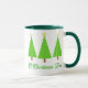 Mug em uma tomada moderna sobre um clássico motivo de árvore de Natal - três árvores em bolinhas verdes limões sobre um fundo verde mais profundo, com o texto "O Árvore de Natal"