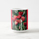 A caneca cerâmica vermelha com um punho preto e um anel preto em torno da parte superior e na parte dianteira é uma fotografia das tulipas vermelhas tomadas pelo fotógrafo Margot Carrera das belas artes