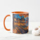Essa Mug apresenta uma mansão assustadora na floresta com janelas iluminadas cercadas por muitas abóboras. Presente perfeito para o Dia das Bruxas! Custom Text.