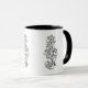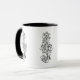 Esta caneca é decorada com uma bela ilustração sobre uma clave coberta de videiras e flores.