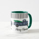 Este Caminhão de Árvore de Natal Azul Vintage apresenta minha pintura de aquarela original de um caminhão carregando de uma árvore de Natal com um toque de riscas azuis e brancas inspiradas no vintage. Personalize o texto para o que quiser! Perfeito para o seu País, Farmhouse ou Decoração de Grainhouse e perfeito para o seu café de Natal ou Cacau!
