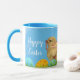Decore sua cozinha com esta linda caneca azul. Esta caneca de café apresenta um design vintage de frango bebê e ovo de Páscoa. O cumprimento pode ser personalizado com o seu texto.