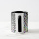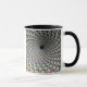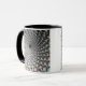 Branco e preto 11 oz. uma caneca combinada com uma imagem, em ambos os lados, de um vórtice fractal, borbulhante, de espirais folhosas verdes, rosa, roxas e amarelas. Ver pote de doces, frasco, azulejo de cerâmica quadrada, trivet de mármore quadrado e portas copos. Veja toda a coleção do Fractal Art Mug na seção HOME.