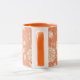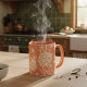 Uma caneca de café com o padrão floral desenhado por William Morris, o artista britânico conhecido por seus designs de papel de parede. Flores de tulipas selvagens num fundo de pêssego.