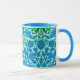 Mug de café em uma safra do padrão William Morris de hífenes, tulipas e folhas, em tons de azul-cobalto e ceruliano profundo, acentuados com marinho, amarelo e verde limão, sobre fundo azul-pastel do céu
